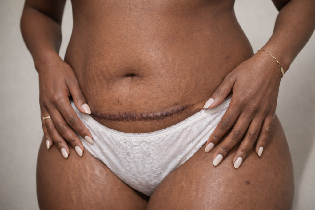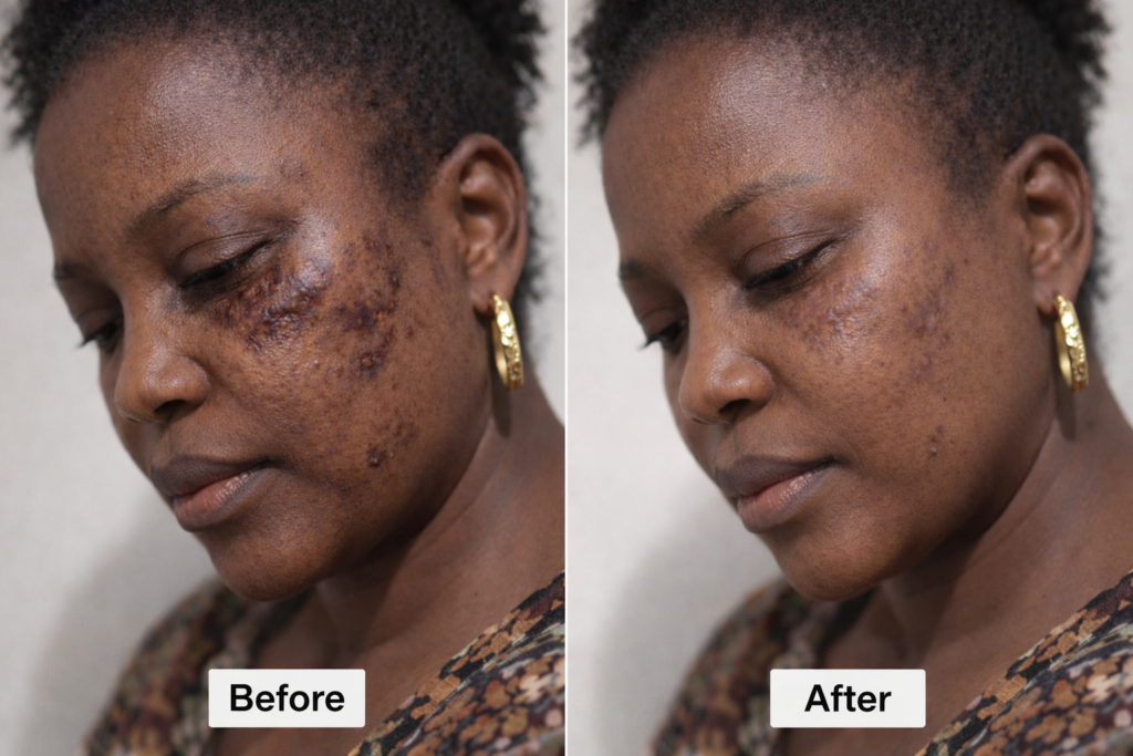 My name is Blessing, and for years I lived with scars that made me feel invisible. After my second baby, my belly was covered in stretch marks. My C-section scar sat there like a permanent reminder. I also had old acne scars on my face that no amount of makeup could hide.